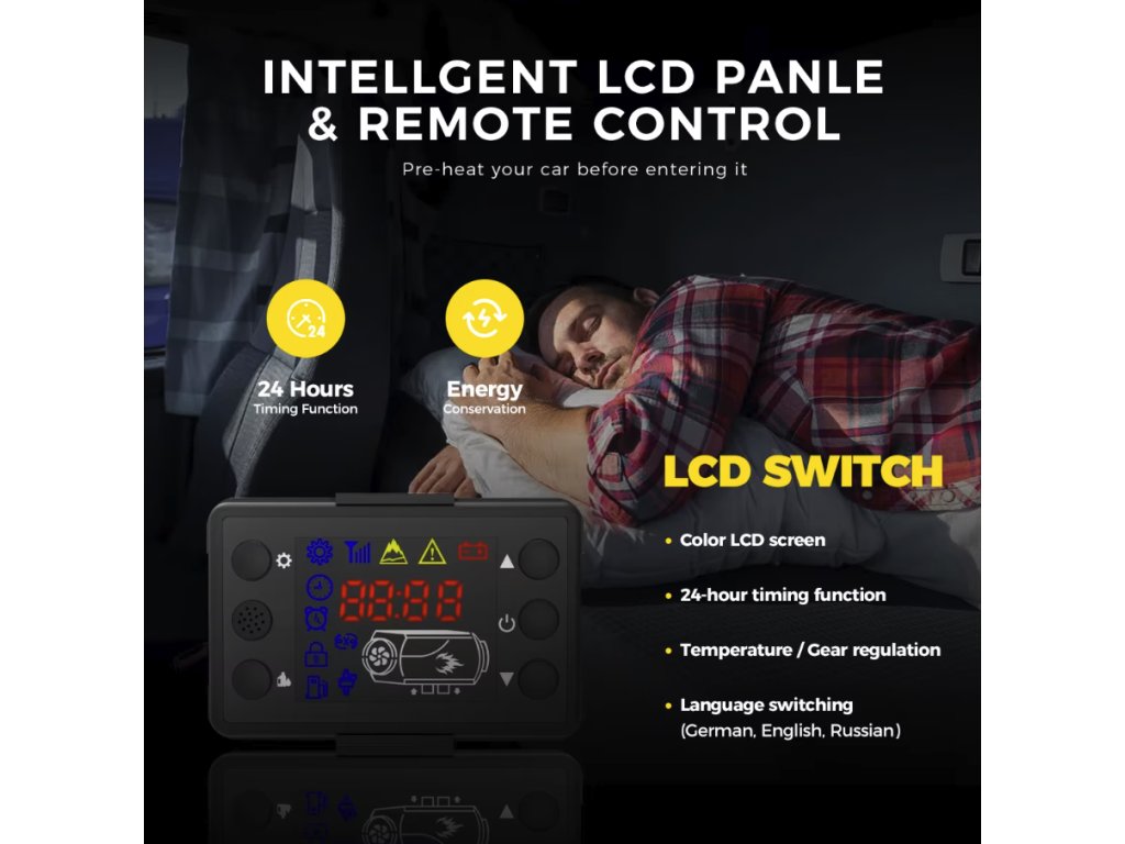 8 kW Nezávislé topení 230V, 24V a 12V All-in-One s displejem, Bluetooth Aplikace, dálkovým ovladačem a CO alarmem