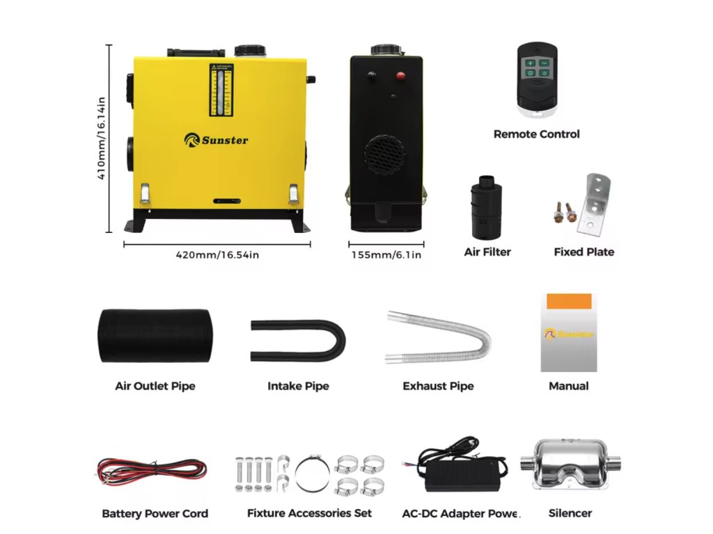 Topení pracuje tiše (≤ 75 dB), má stabilní přívod paliva a nízkou spotřebu. Součástí balení je kompletní montážní sada – včetně nádrže na naftu, kabeláže, hadic a upevňovacích prvků – takže instalace je rychlá a bez starostí.