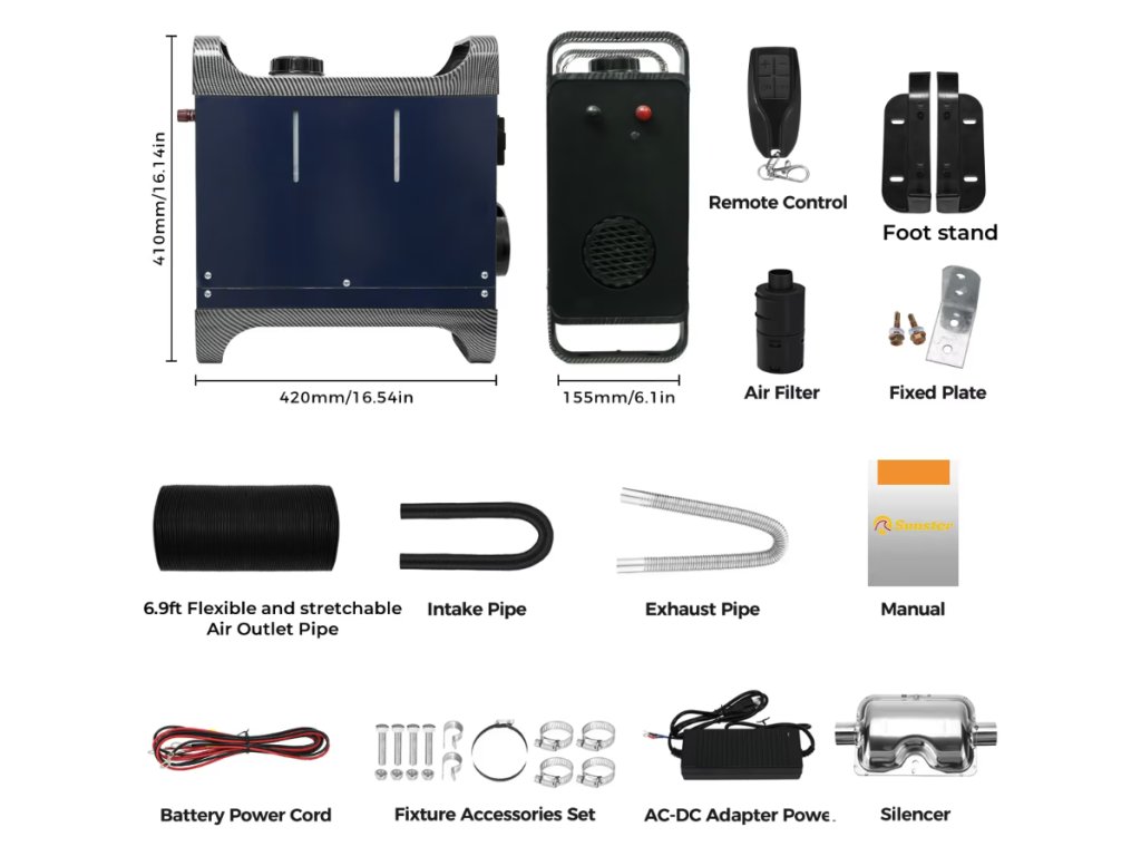 Topení pracuje tiše (≤ 75 dB), má stabilní přívod paliva a nízkou spotřebu. Součástí balení je kompletní montážní sada – včetně nádrže na naftu, kabeláže, hadic a upevňovacích prvků – takže instalace je rychlá a bez starostí.