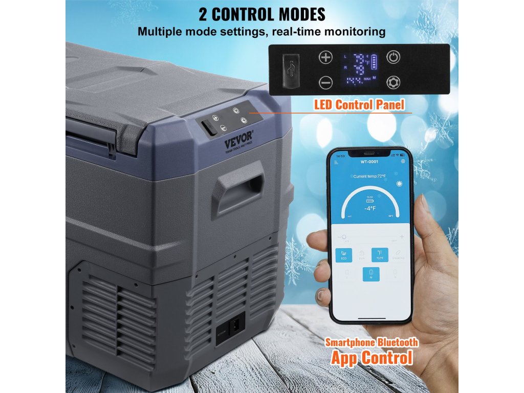 - LED obrazovka a ovládání Bluetooth: Ovládací panel LED umožňuje přímo sledovat provozní stav autochladničky a kdykoli upravit teplotní rozsah. Na panelu můžete nastavit libovolnou teplotu mezi -20 °C až 20 °C / -4 °F až 68 °F. Elektrický chladič má také režim Bluetooth, který umožňuje připojení k mobilní aplikaci pro dálkové ovládání.