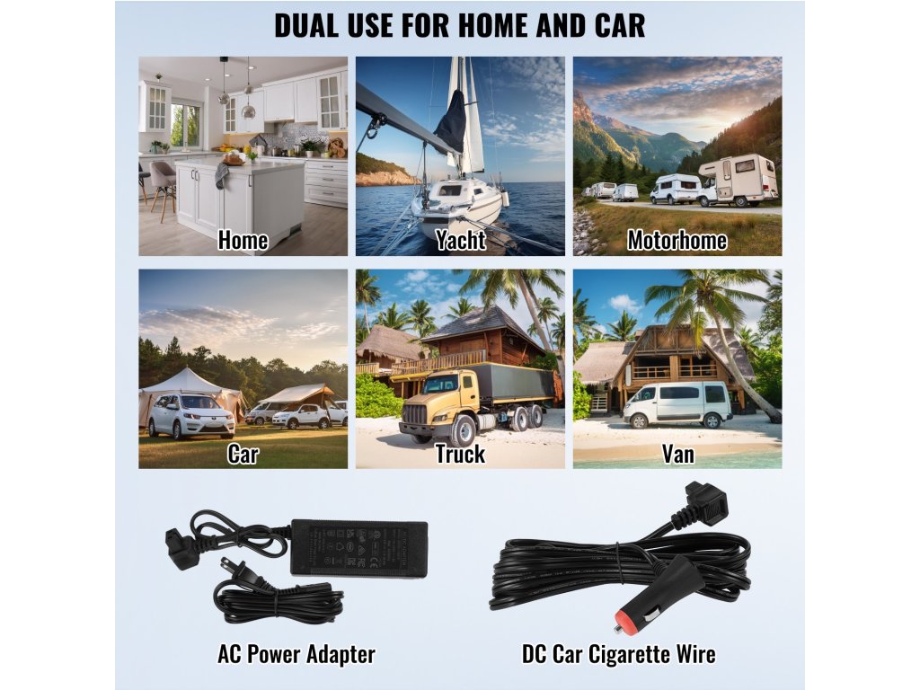 - Dvojí použití pro domácnost/auto: Autochladnička je dodávána s adaptéry 110/240 V AC a 12/24 V DC, což umožňuje její použití doma, na jachtách, RV, autech, kamionech a dodávkách.