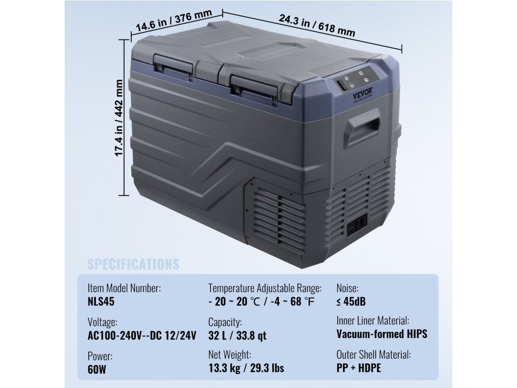 Materiál vnějšího pláště: PP + HDPE, Teplota Nastavitelný rozsah: - 20 ~ 20 ℃ / -4 ~ 68 ℉, Materiál vnitřní vložky: Vakuově tvarovaný HIPS, Kapacita: 32 L / 33,8 qt, Hlučnost: ≤ 45 dB, Napětí: AC100-240 V (50/120 Hz) DC 24V, Číslo modelu položky: NLS45, Net Hmotnost: 13,3 kg / 29,3 lbs, Výkon: 60 W, Velikost produktu: 618 x 376 x 442 mm / 24,3 x 14,8 x 17,4 palce