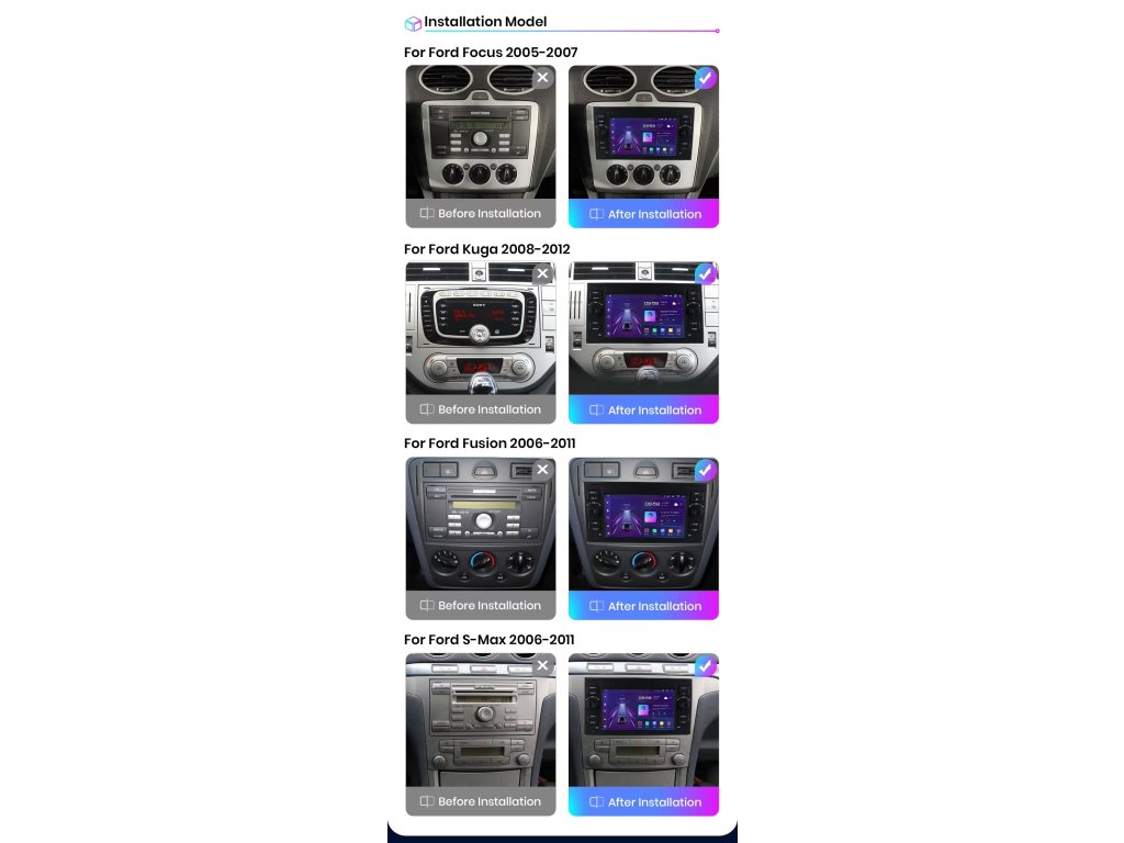 Velmi jednoduchá montáž, autorádio je s rámečkem a veškerou kabeláží pro snadné zapojení pro Ford Focus Mondeo Fiesta Transit Kuga C-Max S-Max
