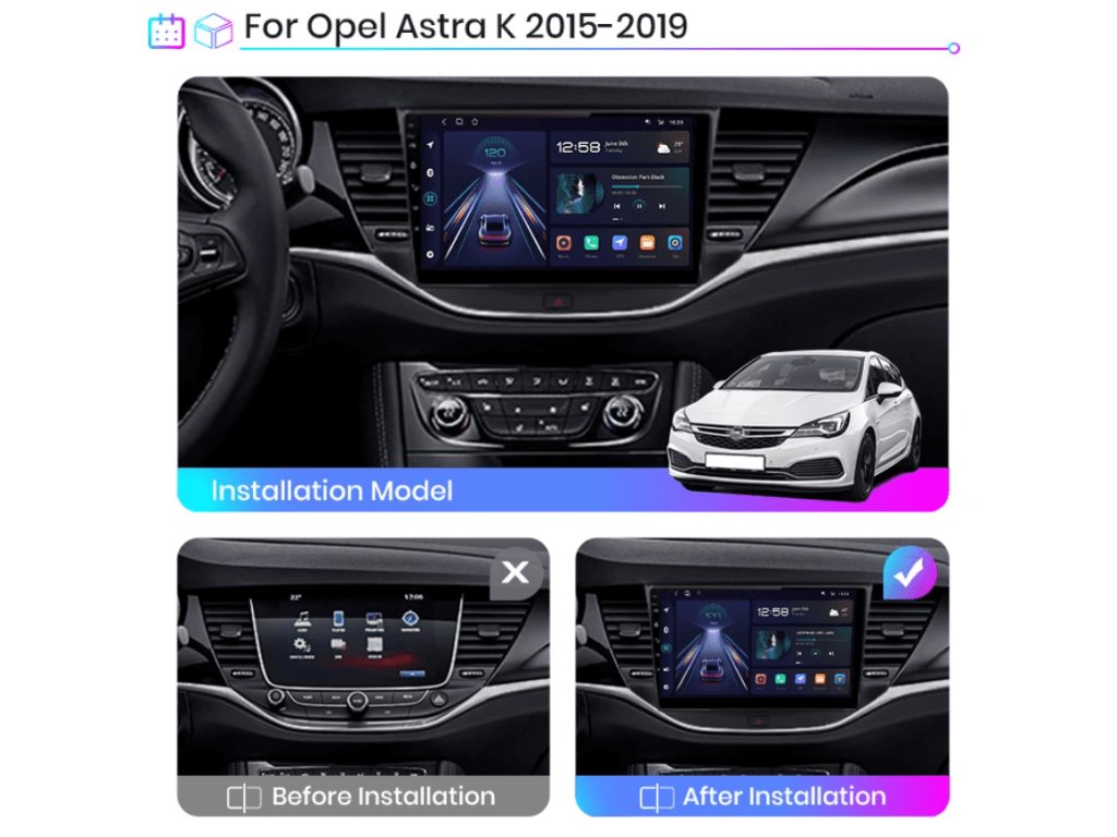 Velmi jednoduchá montáž, autorádio je s rámečkem a veškerou kabeláží pro snadné zapojení pro Opel Astra K 2015 - 2019