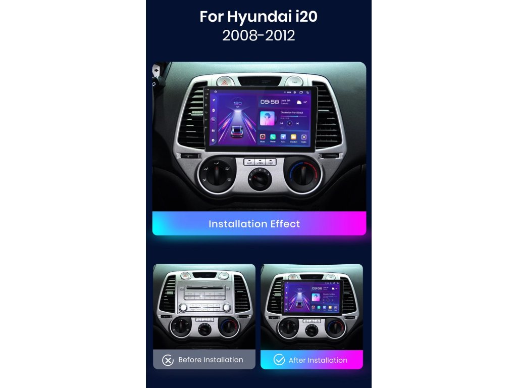 Velmi jednoduchá montáž, autorádio je s rámečkem a veškerou kabeláží pro snadné zapojení pro Hyundai I20 2012-2014