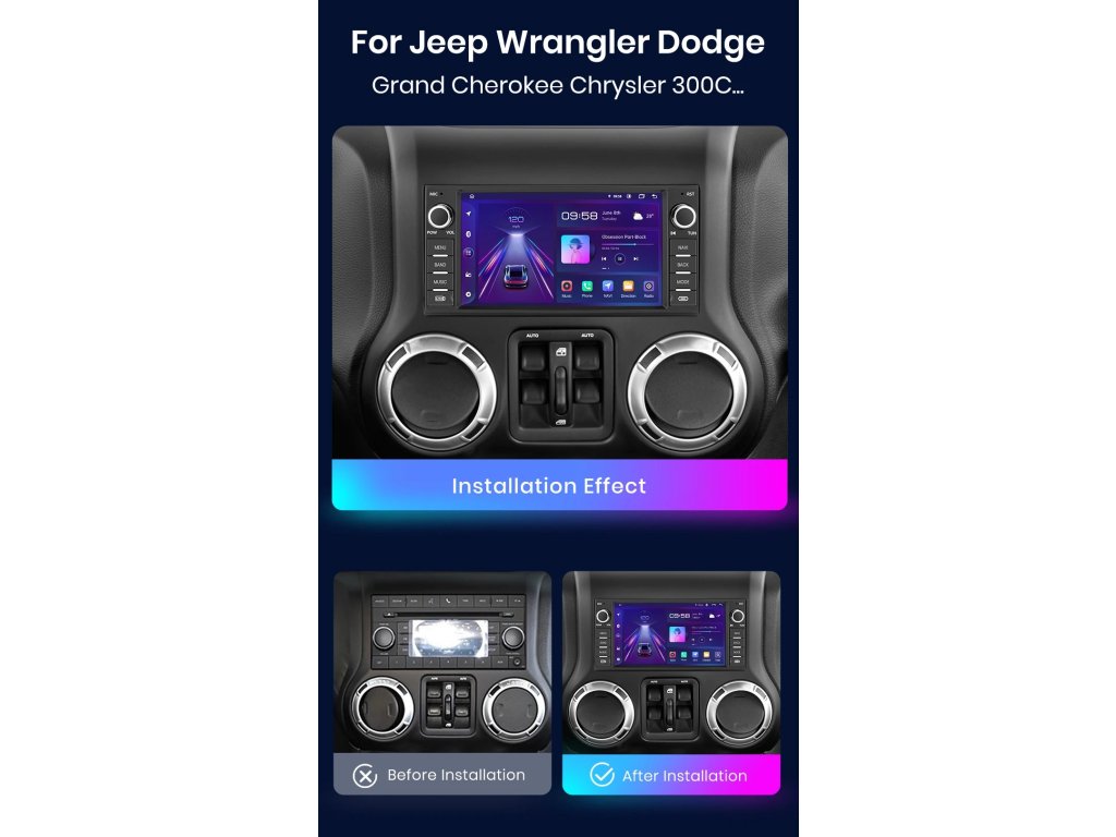 Velmi jednoduchá montáž, autorádio je s rámečkem a veškerou kabeláží pro snadné zapojení pro Jeep Wrangler Dodge Grand Cherokee Chrysler 300C Patriot Commander Caliber Challenger