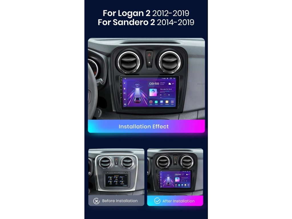 Velmi jednoduchá montáž, autorádio je s rámečkem a veškerou kabeláží pro snadné zapojení pro Renault Logan 2 Sandero 2014-2019