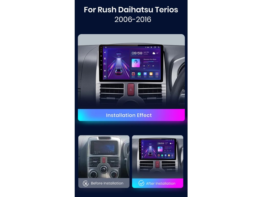Velmi jednoduchá montáž, autorádio je s rámečkem a veškerou kabeláží pro snadné zapojení pro Toyota Rush DAIHATSU TERIOS 2006