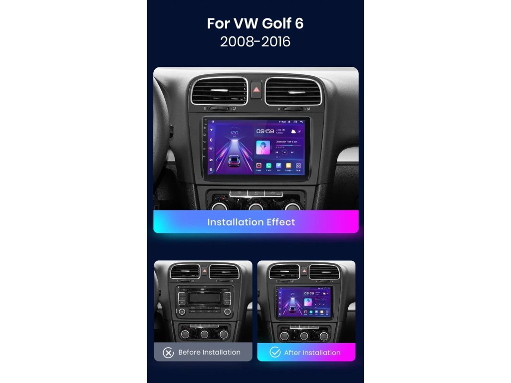 Velmi jednoduchá montáž, autorádio je s rámečkem a veškerou kabeláží pro snadné zapojení pro Volkswagen Golf 6 2008-2016