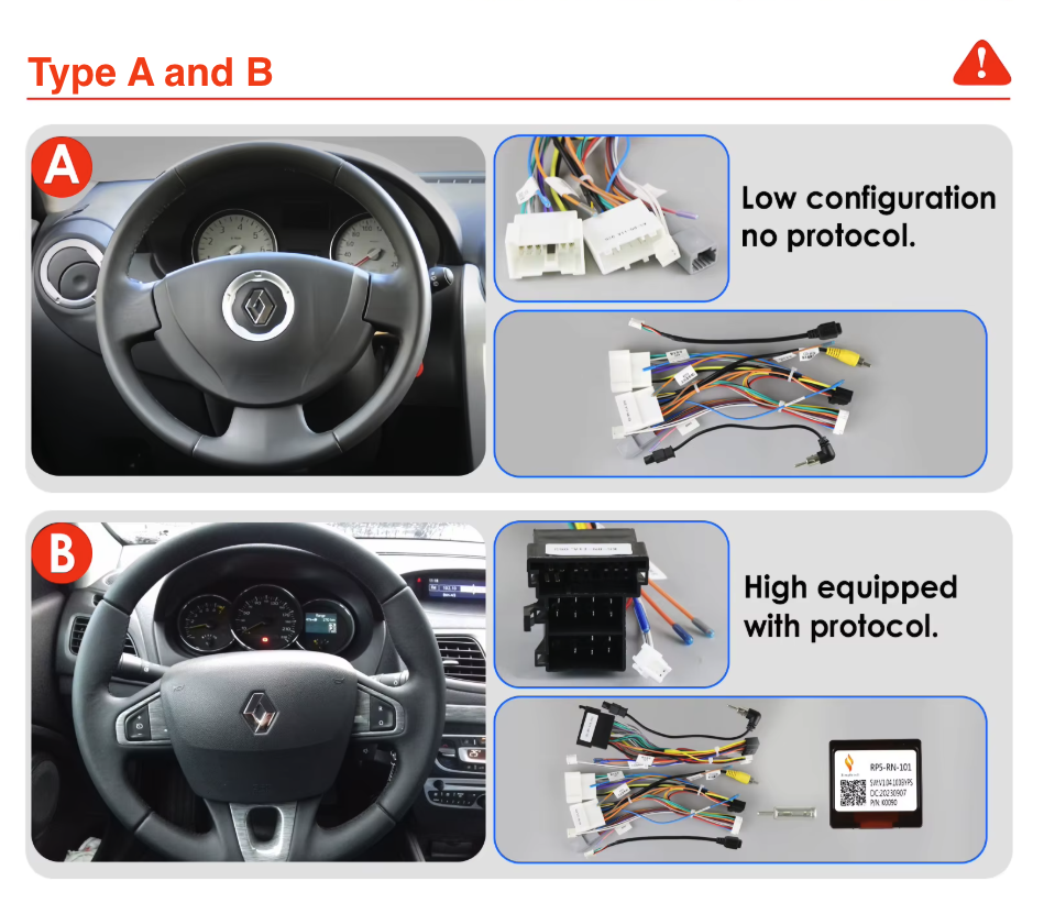 ❗ Věnujte prosím pozornost 2. obrázku. Pokud máte multifunkční volant nebo páčku pro ovládání autorádia pod volantem, zvolte typ "B", pokud nemáte, zvolte typ "A".❗