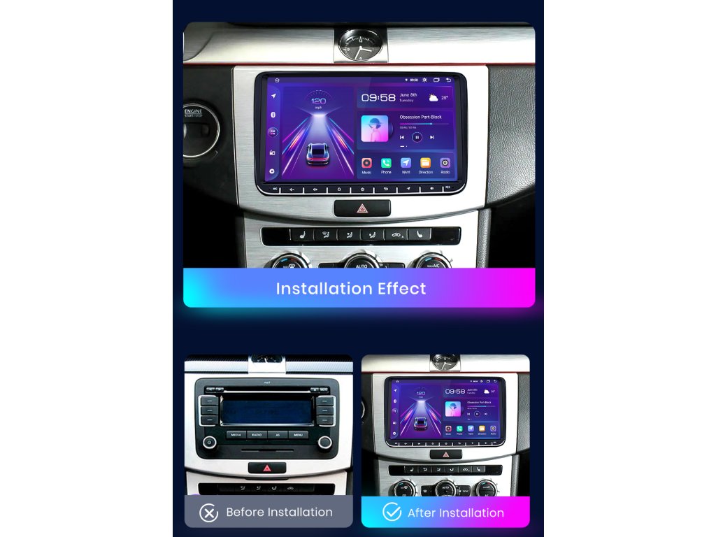 Velmi jednoduchá montáž, autorádio je s rámečkem a veškerou kabeláží pro snadné zapojení pro VW Passat B6 B7 T5 Tiguan Touran GOLF POLO Skoda Seat