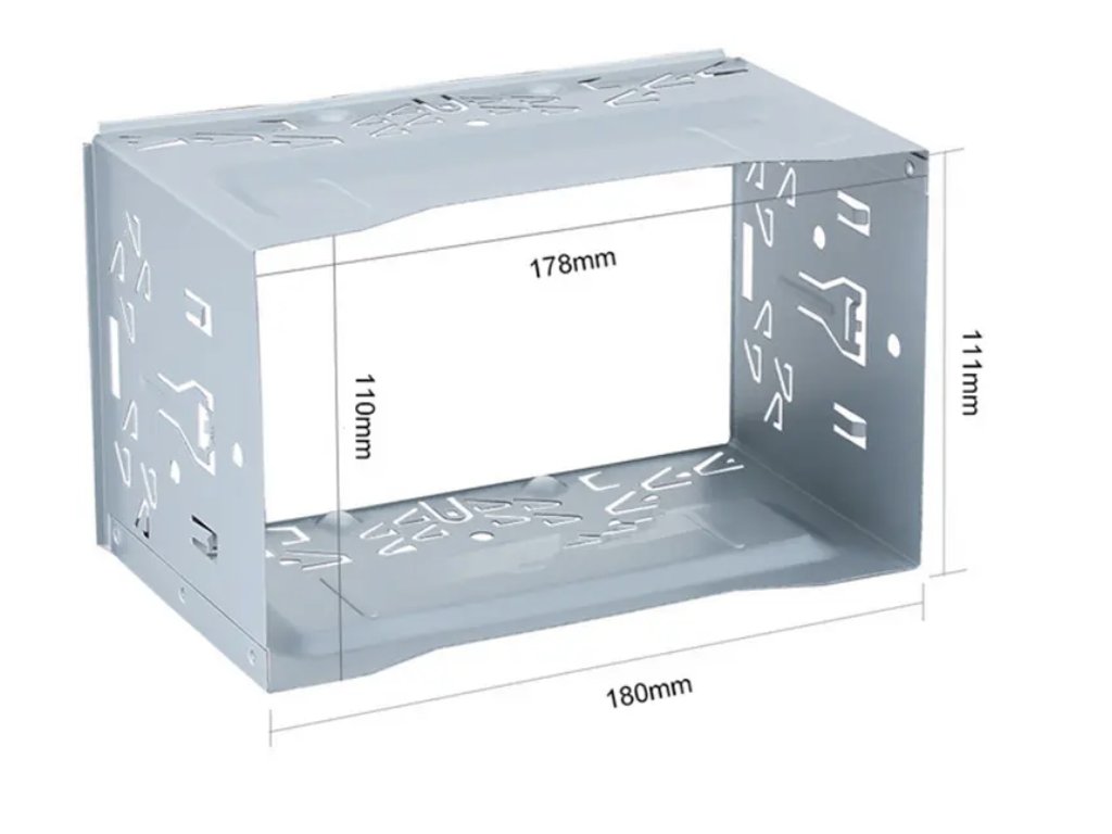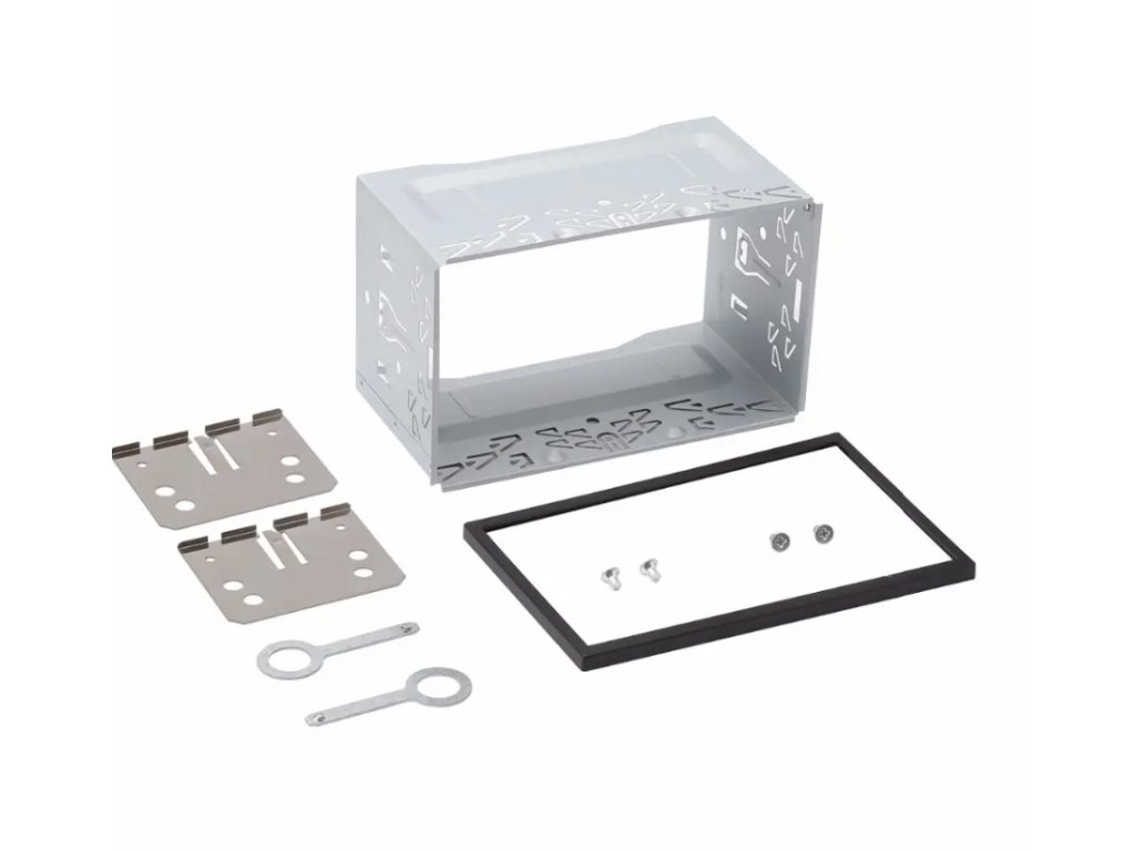 Plechový univerzální montážní rámeček pro 2DIN autorádia slouží k bezpečné instalaci multimediální jednotky do palubní desky vozidla. Tento kovový držák (tzv. montážní klec) se zasouvá do plastového redukčního rámečku nebo přímo do otvoru v palubní desce a zajišťuje pevné uchycení autorádia.