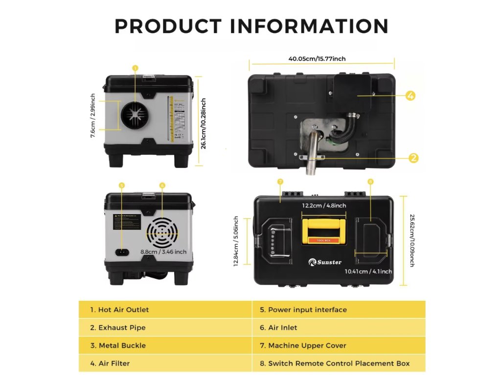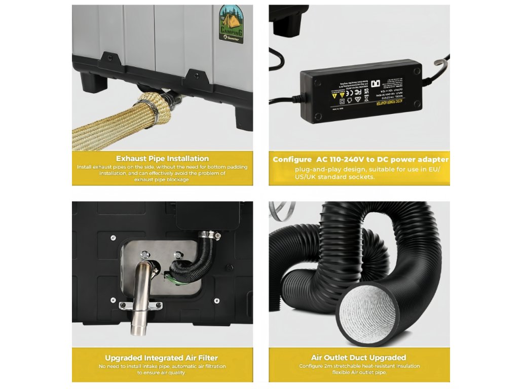 Rychlé a efektivní vytápění: Díky výkonnému 8 kW topnému systému a hliníkovému výměníku tepla dosáhnete požadované teploty během 10 minut. Ohřívač pokrývá plochu 20-25 m², což z něj činí ideální volbu pro auta, karavany, nákladní vozy a další.